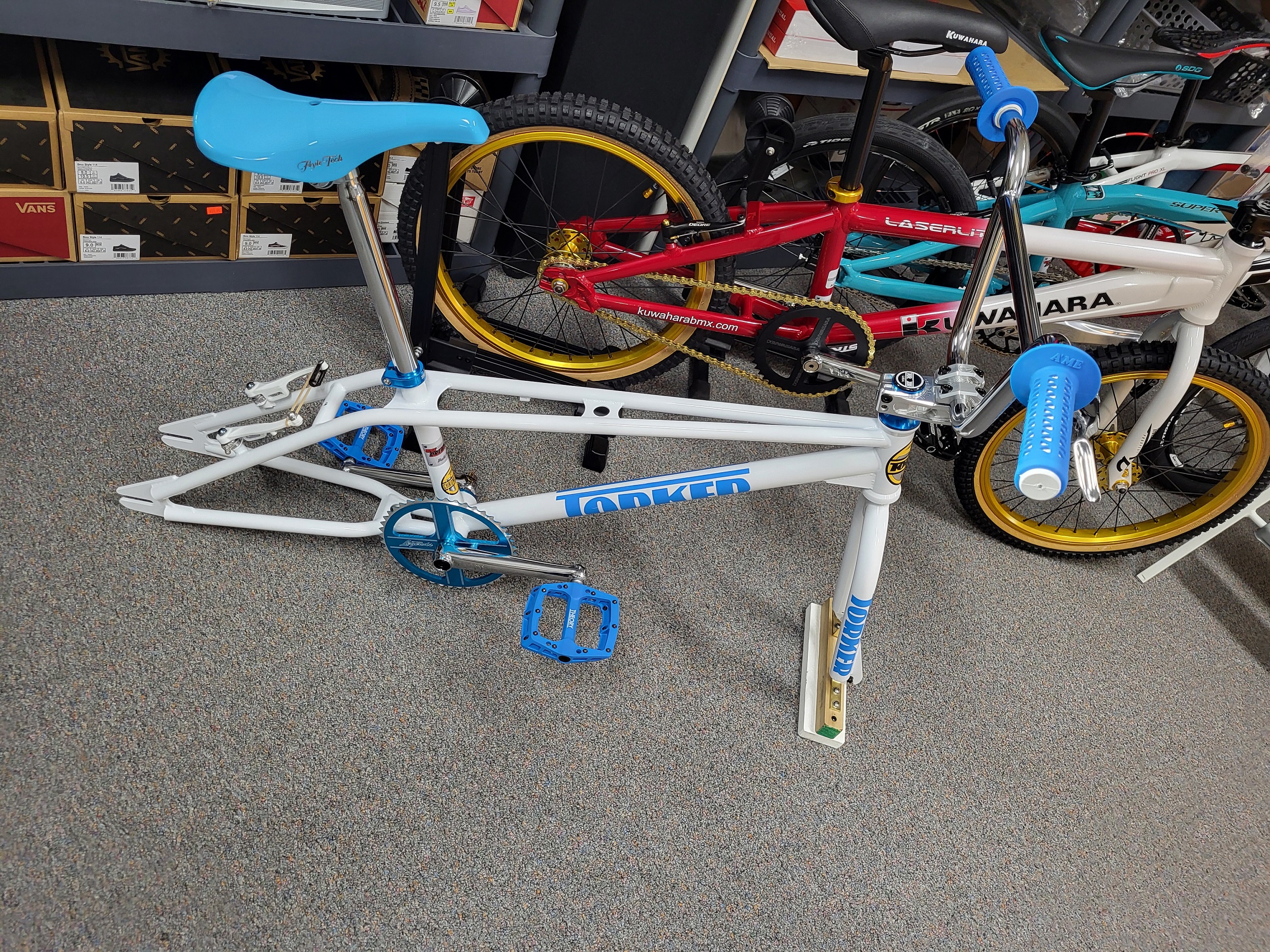 We have a few Torker Projects in the works. These are the Brand New Torker’s that are being made by Bill Ryan (owner of Supercross BMX Bikes) These Frames feature Modern Race geometry so you can race them if you want or use them as a cool bike to cruise around on. This particular build will be based on the White Pro-X frame (XXL) and will feature Maui Blue Skyways. This will basically be a bike you can comfortably cruise around on but if you wanted to take it to a BMX Track and race it, you could! This frame is only 1 of 15 made in White and as mentioned will feature some Maui Blue Components. This should be a cool bike and 1 of a kind with this color combo! (We also have some custom Blue Frame & Fork Decals coming in from Australia!) Check back in early December if you’re interested in this bike. It’s almost done!
